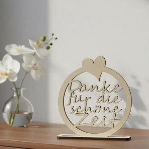 Dieser hochwertige Holzaufsteller ist ein liebevolles Dankeschön, das lange in Erinnerung bleibt. Gefertigt aus stabilem 6 mm Holz, zeigt er den Schriftzug „Danke für die schöne Zeit“ in einer harmonischen, rund ausgeschnittenen Form. Durch den präzisen Laserschnitt wirken die Schriftzüge filigran, aber gleichzeitig robust.